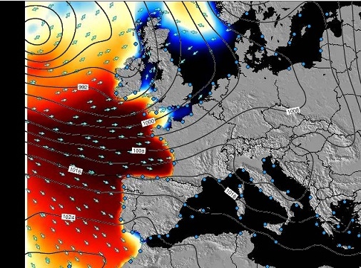 A partir de jeudi un vaste système dépressionnaire à 963hPa sur le Sud-Ouest de l’Islande se creusera à 954hPa et commencera à se diriger vers le centre Atlantique. Vendredi la dépression se déplacera vers le large de l’Irlande et se comblera en avançant vers le Sud. Néanmoins cela donnera lieu à une forte houle qui touchera le Golfe de Gascogne accompagné de vents forts, particulièrement sur la Bretagne.