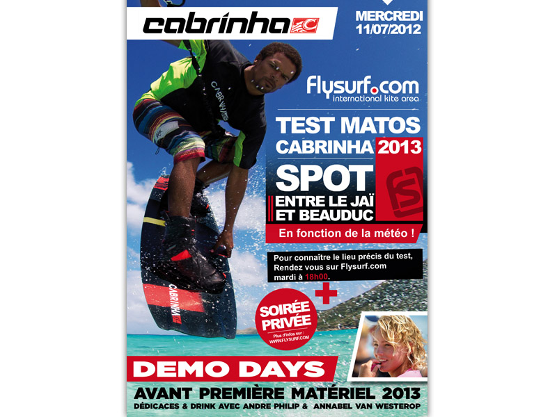 Flysurf.com vous propose une session test Cabrinha 2013 ce Mercredi 11 juillet 2012. Venez tester toutes les dernières nouveautées 2013 (Switchblade, vector, etc...) avec André Philip & Annabel Van Westerop en personnes !.
