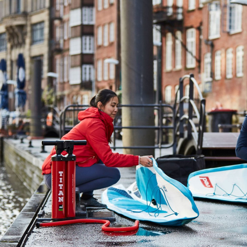 Extrêmement légère, cette pompe double action récemment perfectionnée vous permettra de gonfler votre planche en moitié moins de temps et d'efforts qu'à l'accoutumée.
